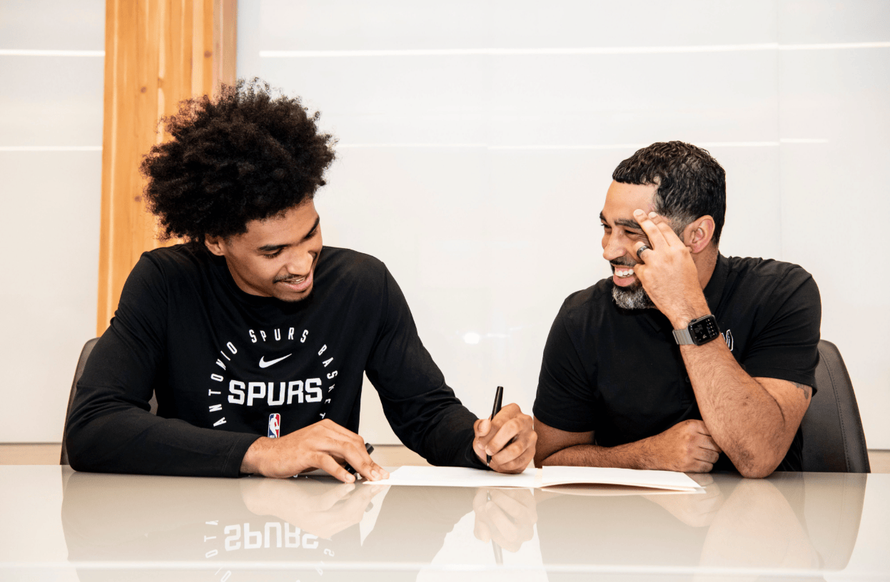 虎扑07月04日讯 今日,马刺社媒晒出总经理布莱恩-赖特与今年的榜眼迪伦-哈珀完成合同签约的瞬间。